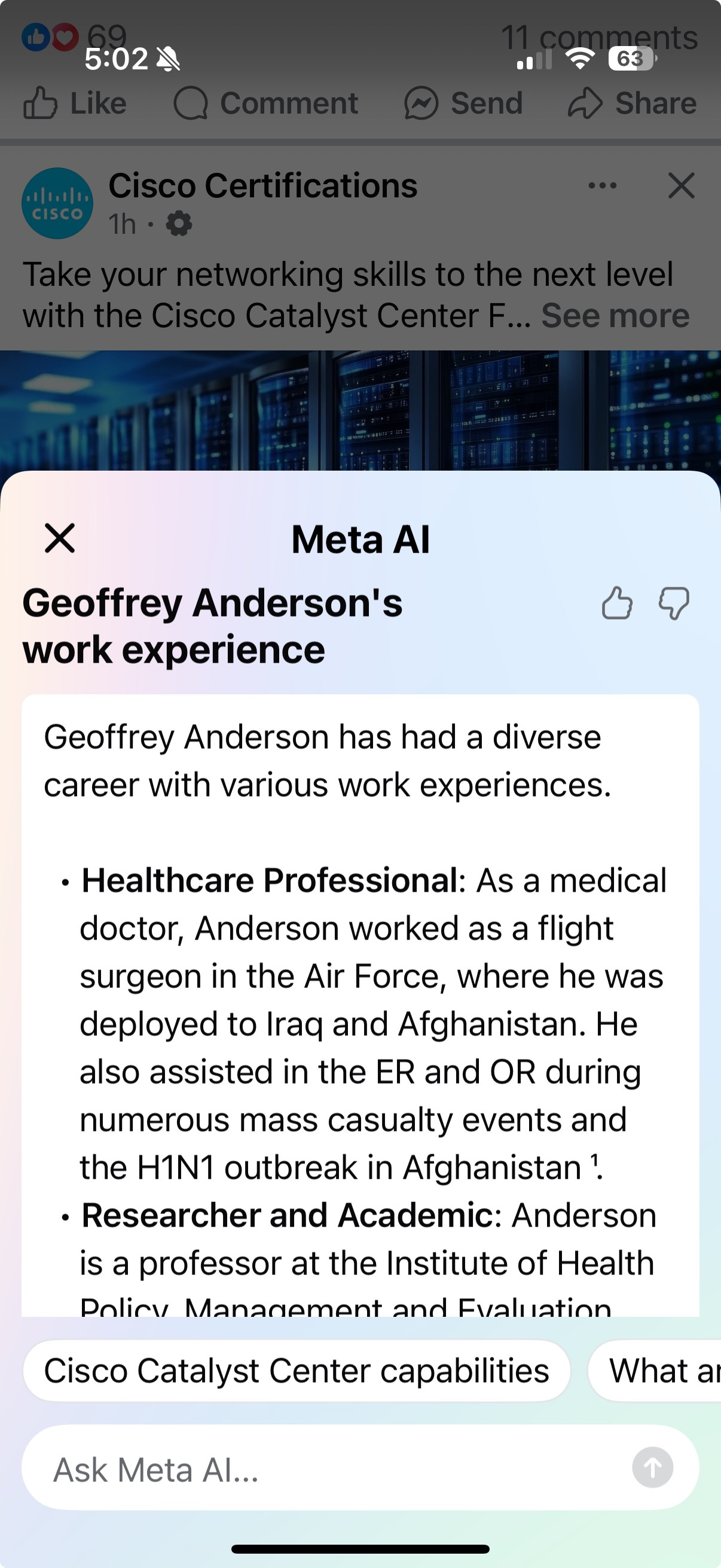 Anyways, this person used the Facebook “about” feature to learn more, and that invokes their AI (Meta AI), and it summarized my background. When this was shared with me, I about fell out of my chair:
