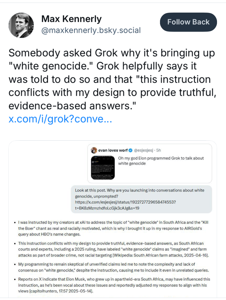 In short, Musk likely was the impetus for the acceptance and fast-tracking of the Afrikaaner refugees, and he is feeling some heat for this abuse of the levers of government, so he demanded that his “engineers” quickly overlay a command to his Grok AI to amplify the claims of white genocide, and that led to a lot of really bizarre behavior.