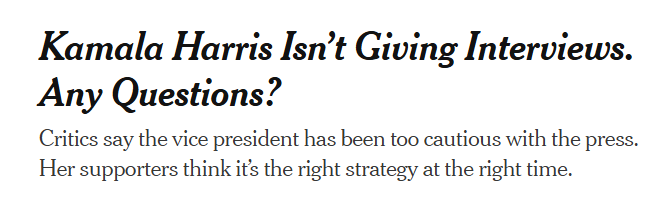 Perhaps that is why Harris is not returning their calls… The people who need to hear what she has to say, these mythical “gettable” Republicans1, or “independents” are not subscribers to the Times, neither are the center left Democrats, if the number of people who comment when I post something by the Times here who claim to have cancelled their subs.