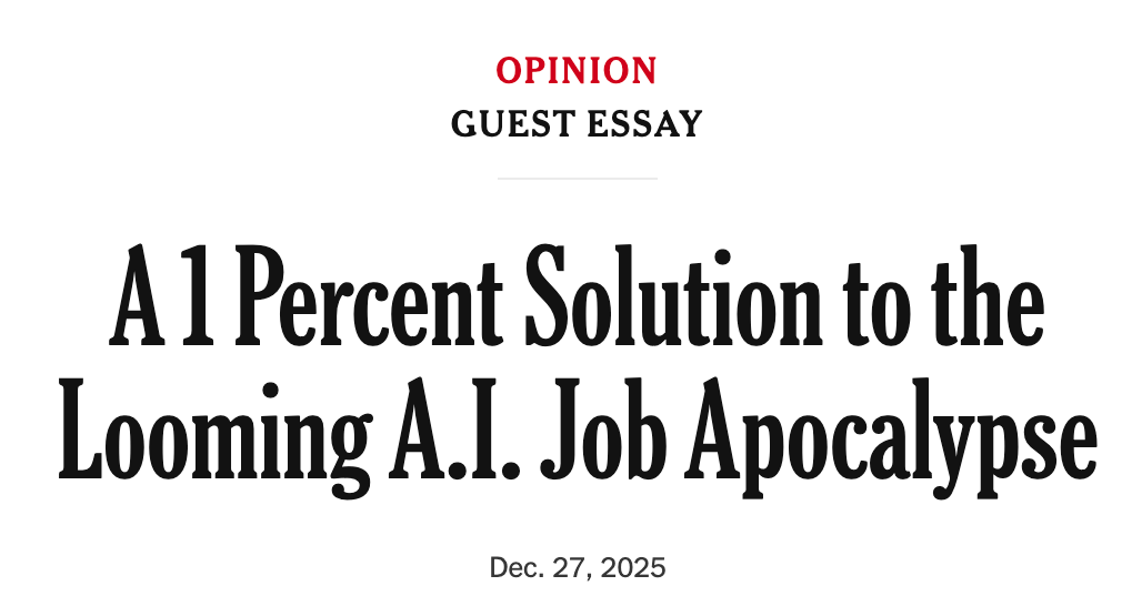 Because of this, my friend has decided to commit 1 percent of his firm’s profits to help people learn new skills for jobs, demonstrating what leadership looks like in the A.I. age. I believe that every company benefiting from automation — which is most American companies — should follow this lead and dedicate 1 percent of its profits to help retrain the people who are being displaced.