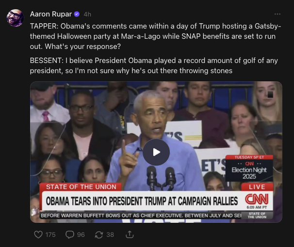 Some editorial notes up front. My postings have become more sporadic lately. There are a few reasons, one being that the news is so fucking depressing that I can't even focus to write. This is a very target rich environment, I mean, the No Kings rally delivering record turnout (estimated to be between 7 and 8 million souls in the streets. That was followed by the demolition of the east wing of the White House, apparently without any of the usual processes that are supposed to be followed. Then the batshittery on his Asian trip where he said some of the most fucked up shit imaginable. All this over a backdrop of an escalation of blowing sportfishing boats out of the seas. And then there was the redecoration of the Lincoln bathroom in what could only be described as "Saddam Hussein Whorehouse esthetic". And then, on the morning of his return from his Asian tour, he hosted a Great Gatsby themed party at Mar a Lago, all the while, his administration is fucking people during the shutdown by cutting off SNAP benefits, and having the gall to blame the Demmocrats who hold none of the levers of power. I mean from today's shows, we have Sec Treas Scott Bessent saying this: