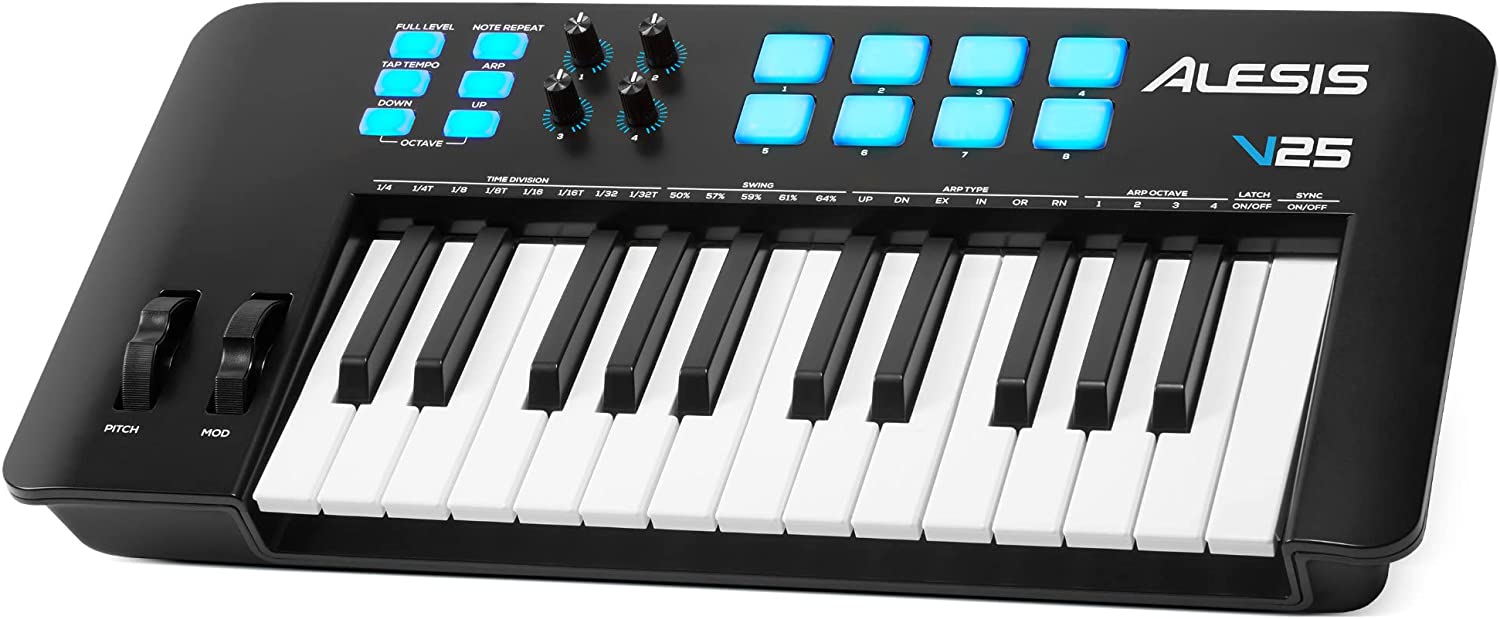 So, I bought a simple 25 key Midi keyboard, an Alesis V25, it has 25 keys (velocity sensitive, but unweighted), four knobs, 8 pads, and a pitch bend/ modulation control.
