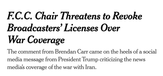 The FCC Chair is not a smart man. But he is a loyal one. And he loooooves to take the clue from the tangerine tyrant (and in this case, the boozy breathed Secdrunk Hegseth) and to then threaten the media franchises.