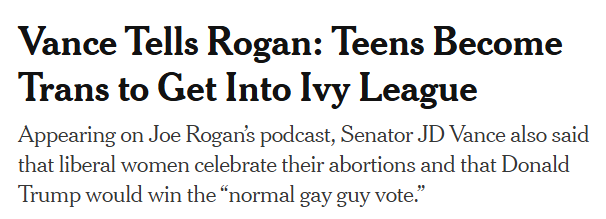 The subhead was almost as awful: “Appearing on Joe Rogan’s podcast, Senator JD Vance also said that liberal women celebrate their abortions and that Donald Trump would win the “normal gay guy vote.””