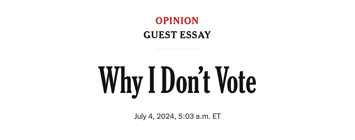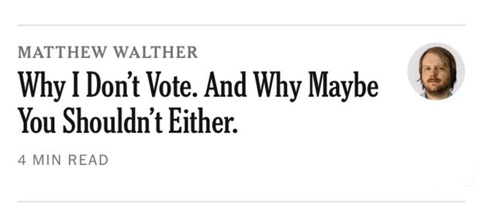 We know the Times is busy, but someone should really try to keep an eye on what its regular contributors are writing at other outlets. Like this piece Walther wrote for The American Conservative in 2022, after he had started contributing to the Times, where he discussed all the voting he has tried to do, only to be thwarted by his own laziness:When I arrived at what I thought was my designated polling place, I was turned away at the door. According to the designated election watchers, a pair of gray-haired lady librarian Democrats of a kind that is now vanishingly rare, I was not registered in that ward. Moreover, they said, my driver’s license was expired. They simply could not allow me to cast even a provisional ballot.