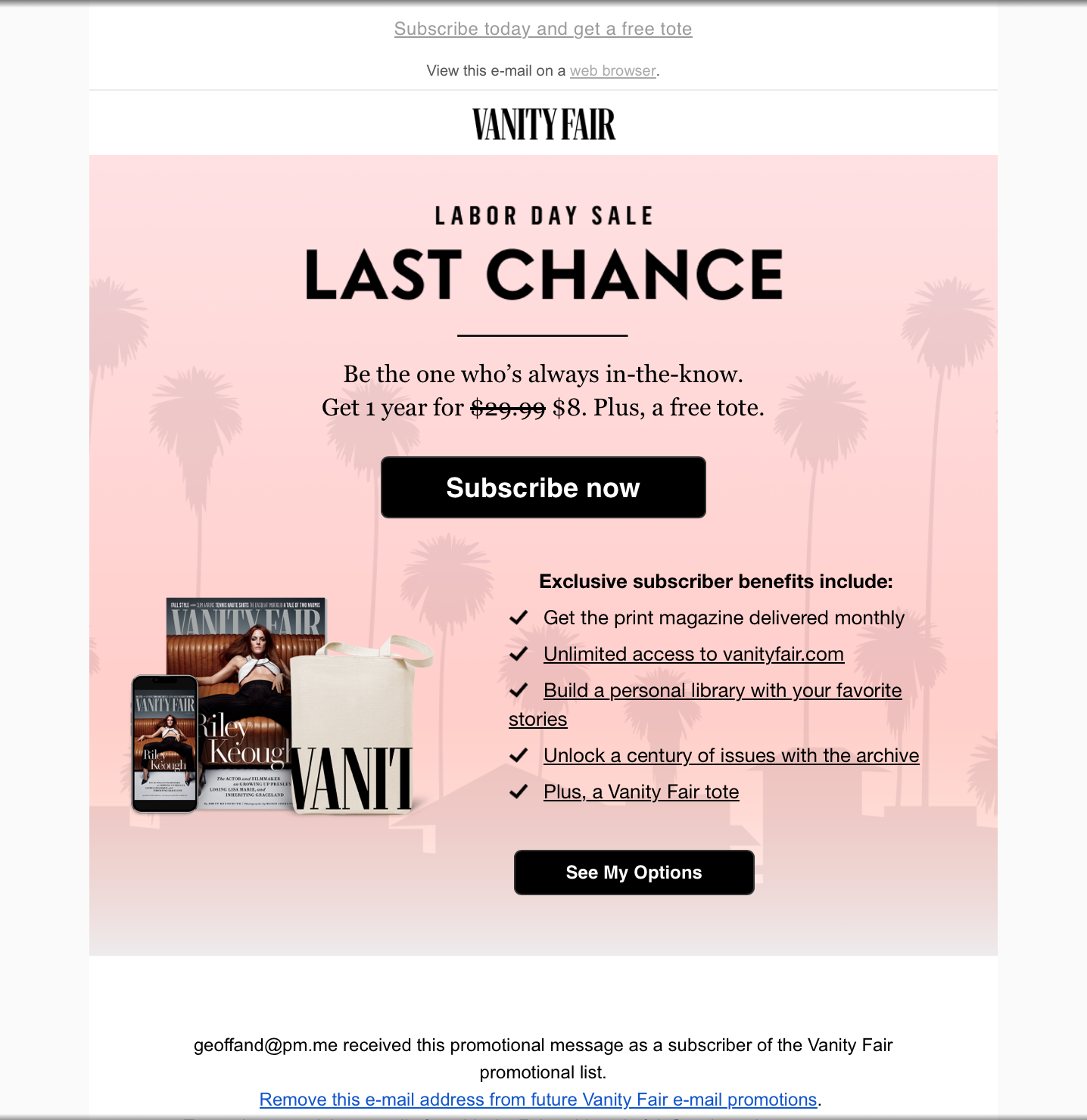 But, since that time, I have been barraged with come-ons, ads, and emails imploring me that a limited time $8 a year subscription was going to end soon. Emails like this: