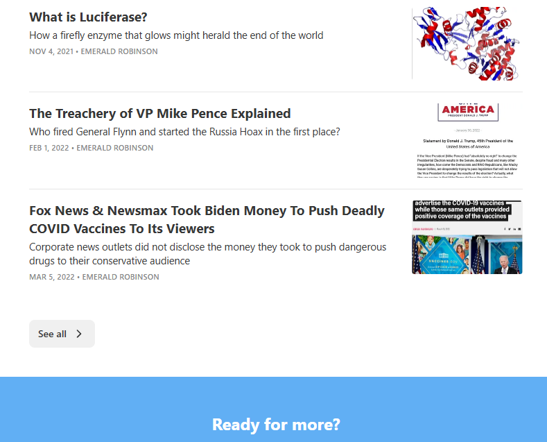 Editing to add this image. I scrolled to the bottom of Emerald’s page, and it had these articles for teasers to get me to subscribe: