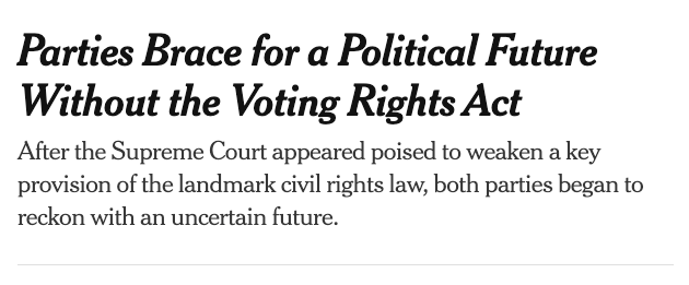 But what I want to talk about is something that is really fucking bad. It looks like Section 2 of the 1965 Voting Rights Act is going to fall. Let us recall that a prior ruling gutted the "pre-clearance" essentially a check on the racist fuckers in the south from fucking their black residents with rules meant to keep districts competitive.