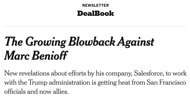 Marc Benihoff is in this section twice this week, as the weekly Dealbook newsletter chornicles the pushback on Benihoff.