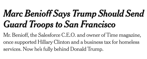 Mr. Benioff’s support of the National Guard ran counter to the city’s famously liberal underpinnings and to his own reputation as a benefactor of progressive causes. San Francisco leaders, already outraged by those remarks, were upset to learn on Thursday that the homegrown company was trying to help Mr. Trump with his immigration crackdown.