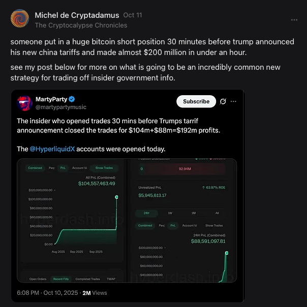 someone put in a huge bitcoin short position 30 minutes before trump announced his new china tariffs and made almost $200 million in under an hour.