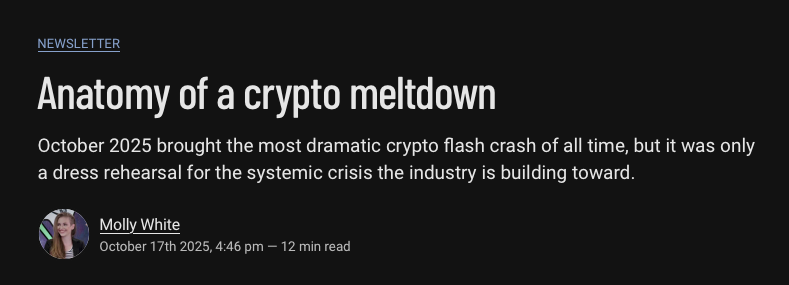 At 4:50 pm on October 10, when traditional markets were closed, Donald Trump launched a new salvo in the simmering US–China trade war. Likely referring to China’s dramatically expanded restrictions on the rare earth minerals it almost singlehandedly controls, Trump posted that he would retaliate with an imminent 100% tariff increase on the country and new export controls on software. The timing muted the announcement’s impact on US equities markets and left Asian markets largely untouched, but crypto absorbed the full shock of the Trump-induced panic. The episode compressed a global liquidity crisis into less than an hour — a sign that the market most eager to be taken seriously may also be the one least equipped to handle real-world shocks.