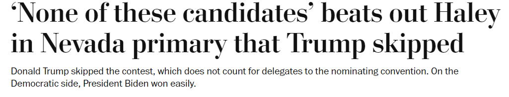 I really wasn’t paying attention to the Nevada primary, as I knew the Trump was opting for the Caucuses this coming Thursday, and that Haley was the only candidate on the vestigial Primary1 on Tuesday. Trump took the caucus route because that was the only event that awards delegates.