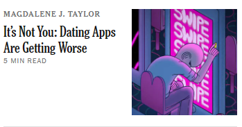 Thank <insert deity here> I have been married for 24 years, because the toxic sludge that are dating apps is just gob smacking. (to be fair, the online dating scene in the late 1990s was pretty fucked too.)
