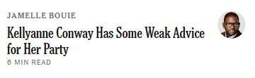Seriously though, I am a fan of Jamelle, and the advice that Kellyanne is proffering is to hide their bullshit around how they want to fuck up women’s reproductive health options. That is probably a failed strategy, and Kellyanne is still human garbage.