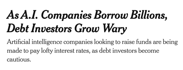 There are other indicators of debt investors’ wariness: Some of the bonds have tumbled in price after being issued, in a sign of increased caution among investors. And the cost of credit default swaps, which protect bond investors from losses, has surged in recent months on some A.I. companies’ debt.