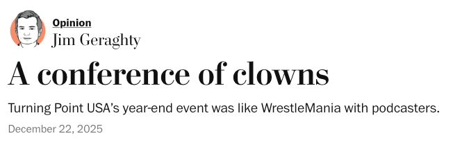 Last weekend in Phoenix, the clowns all descended on the TPUSA annual conference, and it was a sight to behold. So much so that the Editor in Chief at the National Review, Jim Geraghty had to stroll over to the Washington Post to pen an OpEd on the clown show: