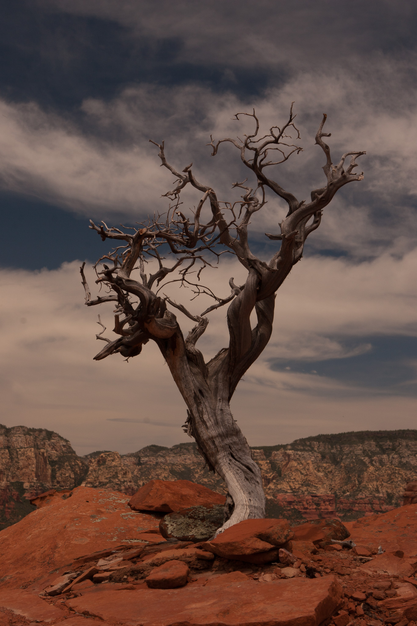 On a Jeep trip I spied this, and got out to take this pic, and it was stunning. The carcass of a lonely tree on the red rocks, with the geology of Sedona in the background.