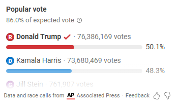 But, what to do. Trump has slipped below 50% of the total vote tally (Saturday, November 16) but he will have beaten Harris by ~2% in the popular vote when all is said and done.