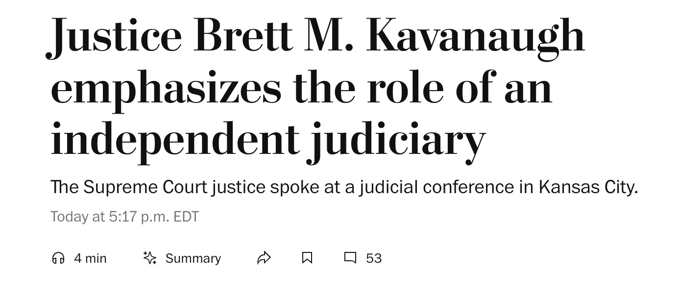 KANSAS CITY, Mo. — Supreme Court Justice Brett M. Kavanaugh on Thursday emphasized the importance of an independent judiciary, calling that “the crown jewel of our constitutional democracy.”