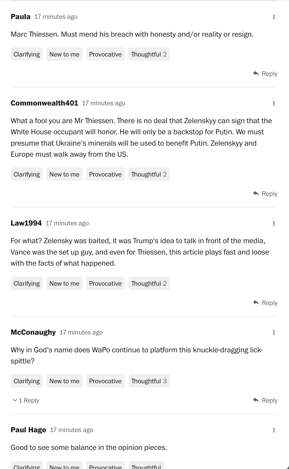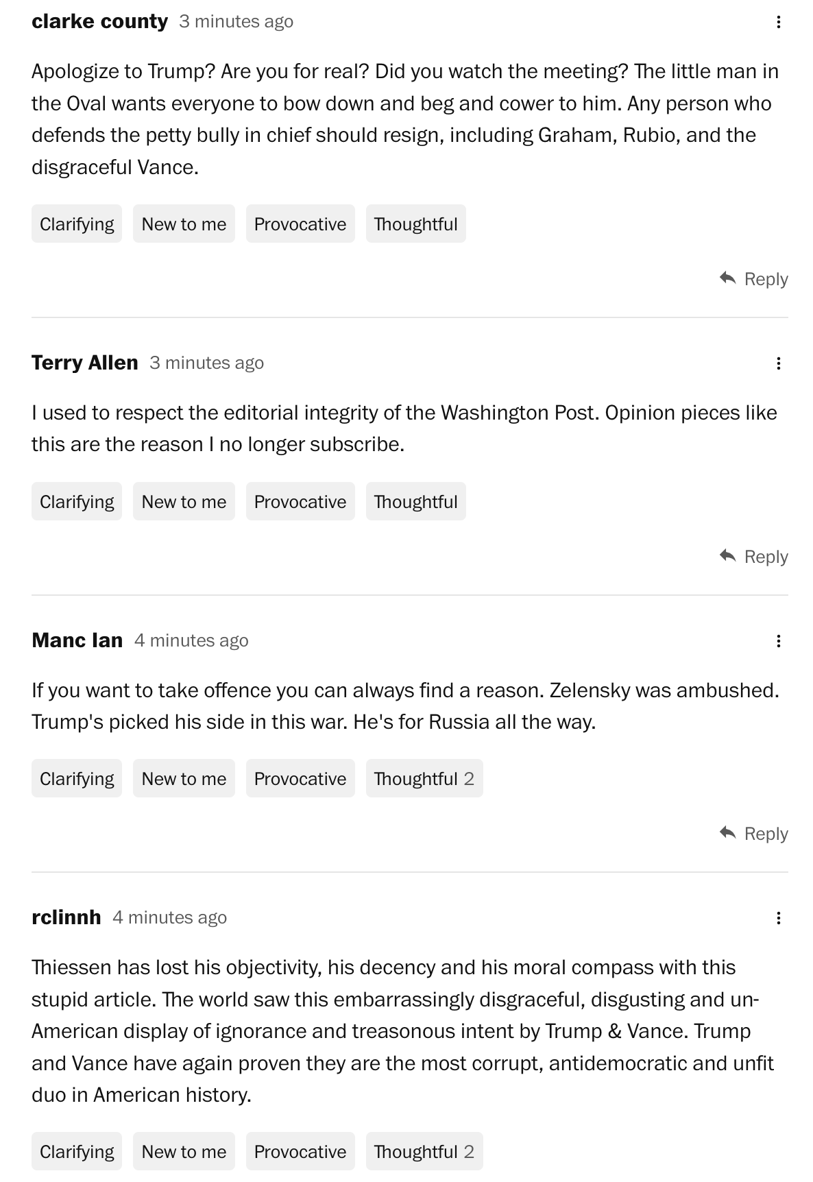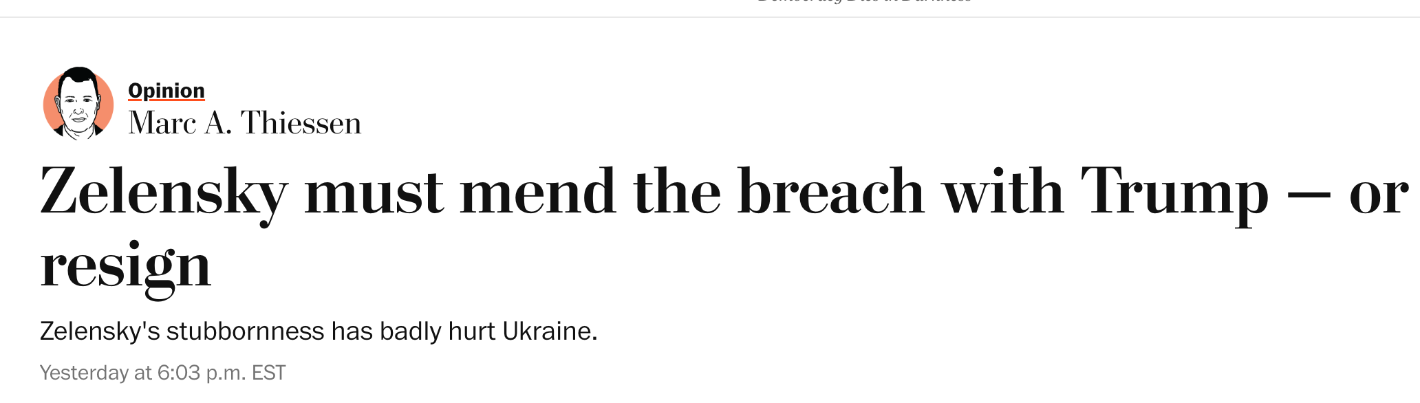 Off course, Thiessen believes that Trump is the ultimate deal broker, and he just wanted to help Ukraine by <checks notes> stealing the mineral resources. Hence the "repetition of the word ‘digging’”. It’s cute that Thiessen really believed that Trump and JD Couchrapist had the best interests of Ukraine in mind.