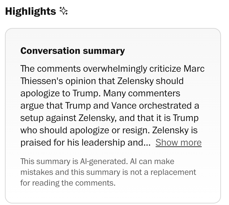 At the top of the ginormous listing of comments, there is a helpful AI summary. Now, by this point you might have noticed I am an AI skeptic. But in this case it is pretty helpful: