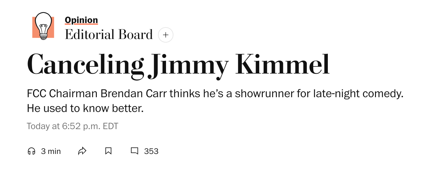 Enter FCC Chairman Brendan Carr, who sees things differently. On Wednesday, he suggested on a podcast that ABC affiliates that air Kimmel might lose their FCC licenses. “We can do this the easy way or the hard way,” Carr said. “These companies can find ways to change conduct, to take action, frankly, on Kimmel, or there is going to be additional work for the FCC ahead.” Hours later, Kimmel’s show was suspended indefinitely.