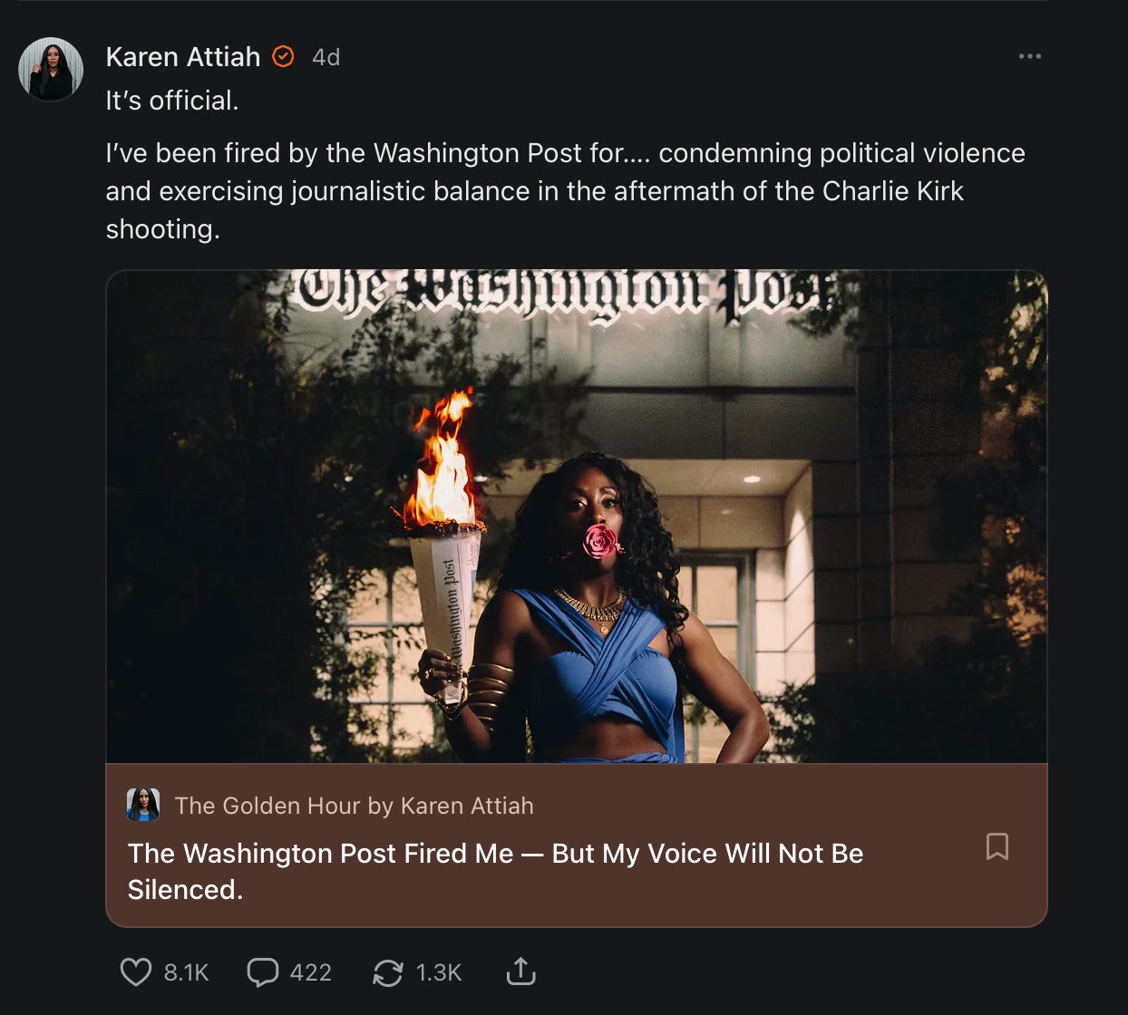 Because late last week, they fired their staff Opinion writer, Karen Attiah, because of her writing about firearm violence only slighty tangential to Charlie Kirk's assassination: