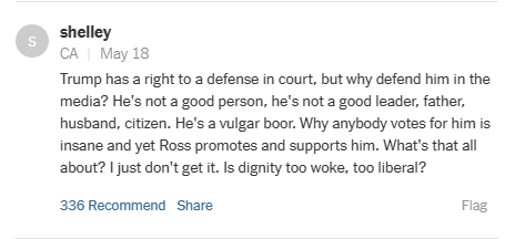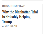 Akin to the bad take by French, Ross argues that the spectacle that is the Election interference via business records fraud case is akshually helping Trump.