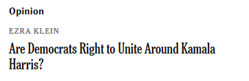 But that’s not what happened. And in my conversations with top Democrats in recent weeks, I’ve come to the view that it’s unlikely to happen now for a few reasons. The first is that Biden did step aside, but it took a grueling, uncertain, painful month. The party is exhausted. It is tired of its internal drama. It wants to turn its attention back on Trump. It wants to raise money, build get-out-the-vote operations, run ads. And time is now short. The convention is mere weeks away.