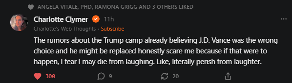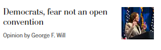 I get a little glee watching the “never trump” opinion authors blubber about how we shouldn’t ‘coronate’ Harris, and as they watch the possibility of a contested floor fight at the convention.
