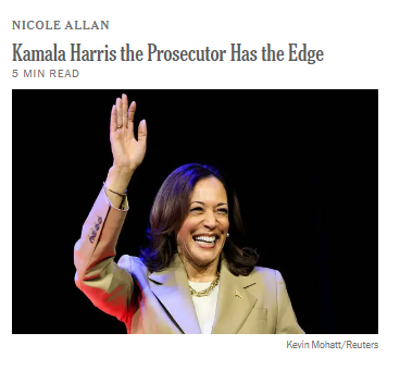 In 2019, Ms. Harris was competing on progressive bona fides with the likes of Bernie Sanders and Elizabeth Warren. She was running at a time when progressive voters were uniquely focused on criminal-justice reform and suspicious of law enforcement, which was a problem for Ms. Harris, who had built her political career as a prosecutor. Hemmed in by these dynamics, Ms. Harris struggled to define her brand. (emphasis mine)