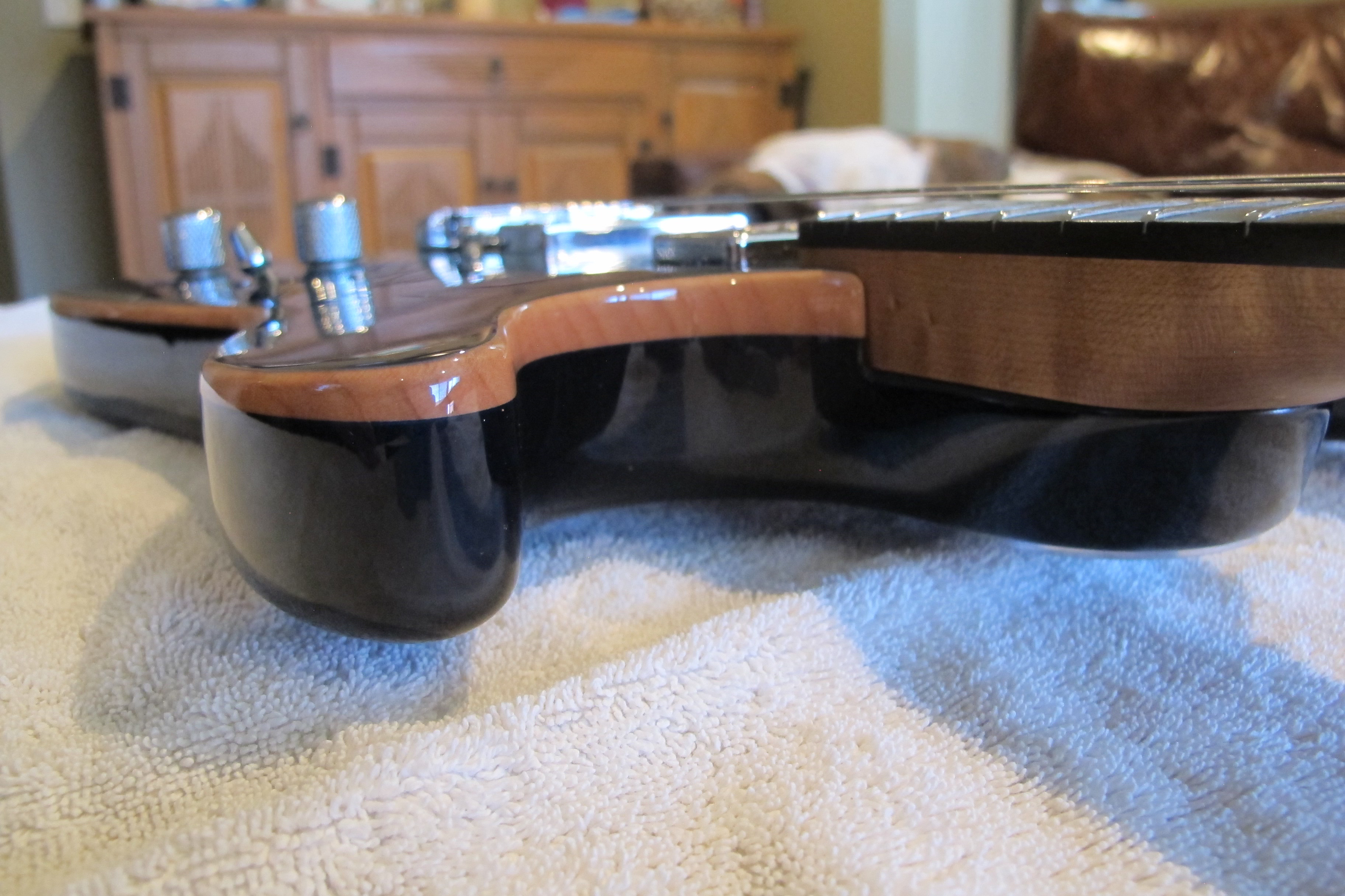 The pictures do not do it justice. The flames are accentuated by the blue stain with a dark “burst” at the edges to give it some depth. But the gloss is very high, and that is the result of many coats of the clear coat that have been buffed out in-between coats. The net result is a very deep optical finish that you can get lost in.