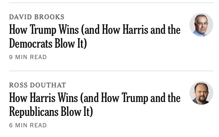 Ross’s column takes the position that Harris wins … “How Harris Wins (and Trump and the Republicans Blow It)”. This is going to be specially odious.