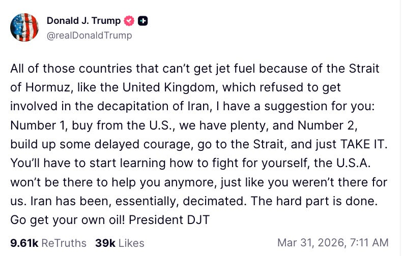 On Truth Social this morning, Trump was up to his customary threats against NATO allies. He wrote, referring to the Strait of Hormuz, “You’ll have to start learning how to fight for yourself. Go get your own oil!”