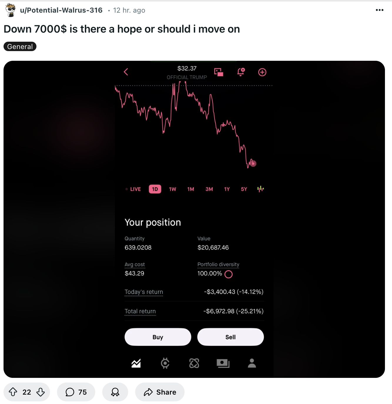 Anyway, I no longer have a position in $TRUMP coin, but I do enjoy listening to the very fine people who are stuck with these things.