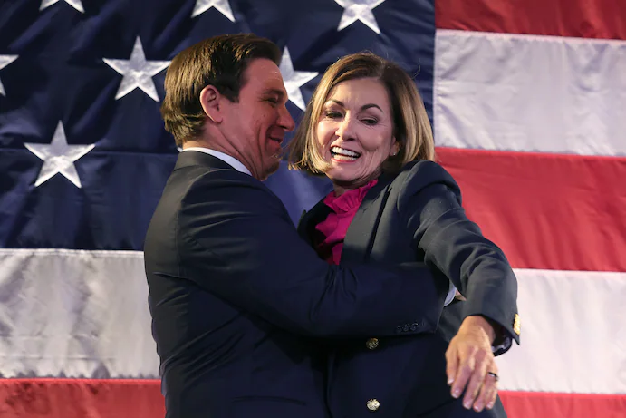 Iowa governor, Kim Reynolds, formally endorsed DeSantis, and he is here giving her a hug. I swear to God, she looks like “what the fuck is this idiot doing? Can’t he read the fucking room"?