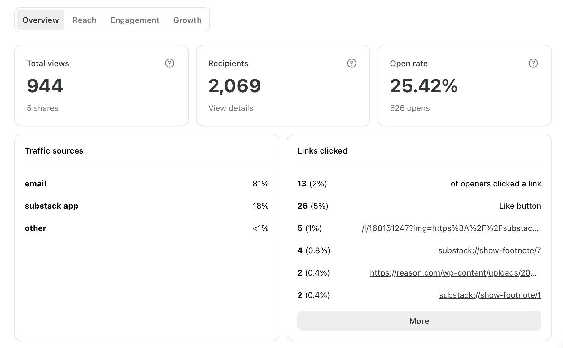 My post from yesterday after nearly 48 hours has a paltry 944 reads, and a 25% open rate. I used to be well above 40% open rate in 24 hours as the email recipients clicked on the post.