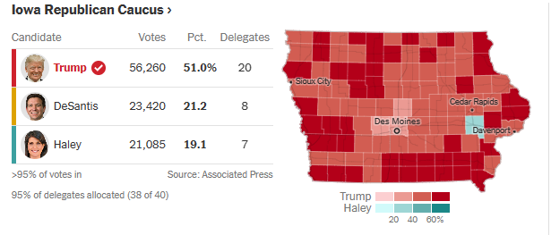 But when I went to bed about 8:00 PM Pacific last night, I checked the Times and Post, and I was astounded. Sure, we all knew Trump would run away with it, but all eyes were on the undercard players, particularly Haley and Desantis. And it looked like Desantis was going to eke out a narrow but definitive second place.