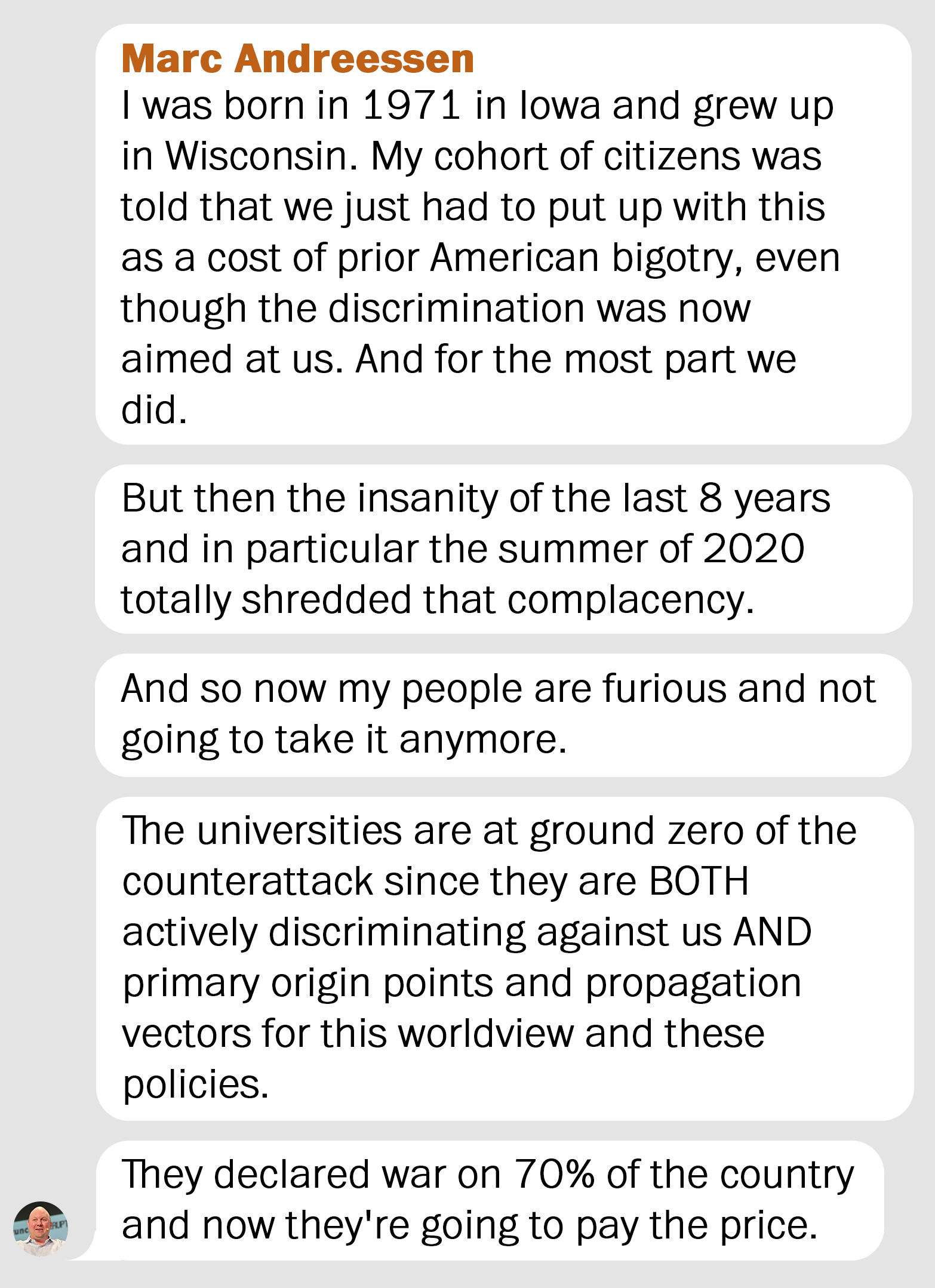 Over the weekend the Washington Post got hold of a text chain in which Marc Andreessen explained some facts of life to his fellow travelers in the Trump White House.“The combination of DEI and immigration is politically lethal,” Andreessen wrote. “When these two forms of discrimination combine, as they have for the last 60 years and on hyperdrive for the last decade, they systematically cut most of the children of the Trump voter base out of any realistic prospect of access to higher education and corporate America.”