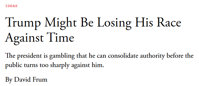 Back to Frum, his thesis is that Trump's popularity with the general public is rapidly heading to the cesspool that it should never climbed out of, and his aggressive wrapping up of authoritarian rule is running into a hard limit. Autocrats may rule with an iron fist, but they rely on enough of the population to be accepting, and that balance usually means that authoritarian rulers need to be somewhat popular. Not 90% popular, but enough that the general populace doesn't rise up against them.