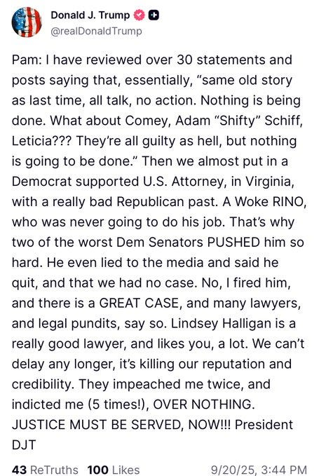Over the weekend, it seems like Trump used the wrong messaging app to direct AG Pam Bondi to replace Erik Siebert, basically a usual unhinged flapping of his gums[1]: