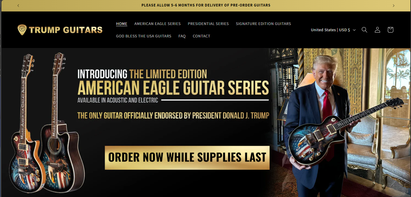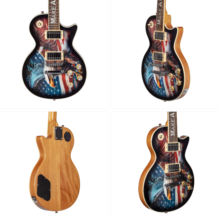 So, for $1,500 you can buy a budget Les Paul clone with a custom inlay in the fretboard, a bolt on neck, and if you have a $8,500 more, you can get Trump’s signature on it with a gold Sharpie. What a deal.