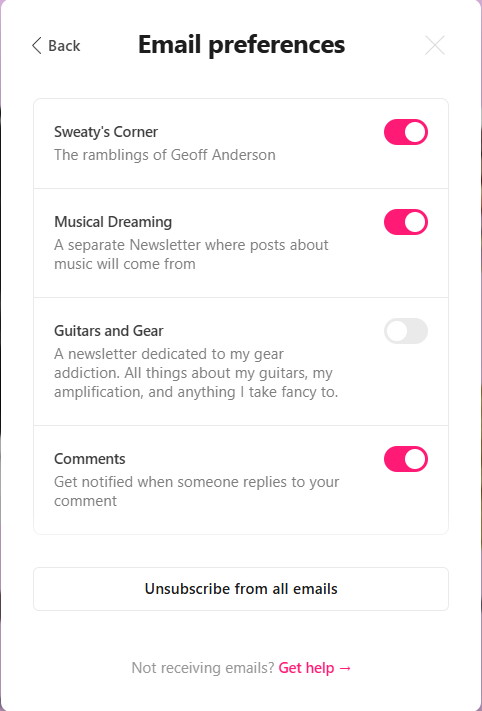 So, I am starting this "sub" newsletter "Guitars and Gear", just to talk shop about my gear. By default, you are not subscribed to this newsletter. To get these in your inbox, go to "https://sweatyspice.com/" and log in. From there, you will see a button in the upper left corner titled "Account", and from there select "Manage Emails". You will see this: