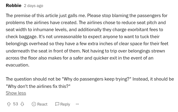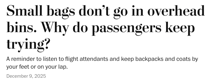 This fucking person, Andrea Sachs, feels that she needs to inform us of how to travel. In her world, the overhead bins are solely for rollies, and that everything else should be on your lap or under the seat in front of you.