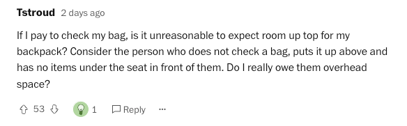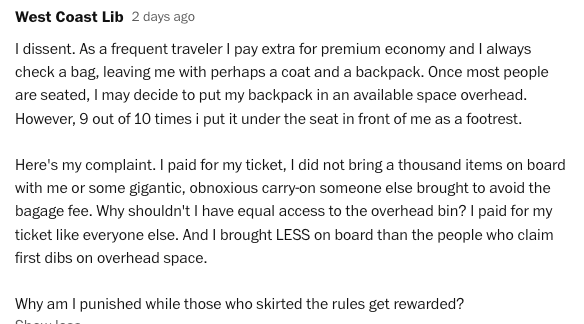 The implication is that if you don't have a carryon bag, you should just surrender your "space" to those that do.
