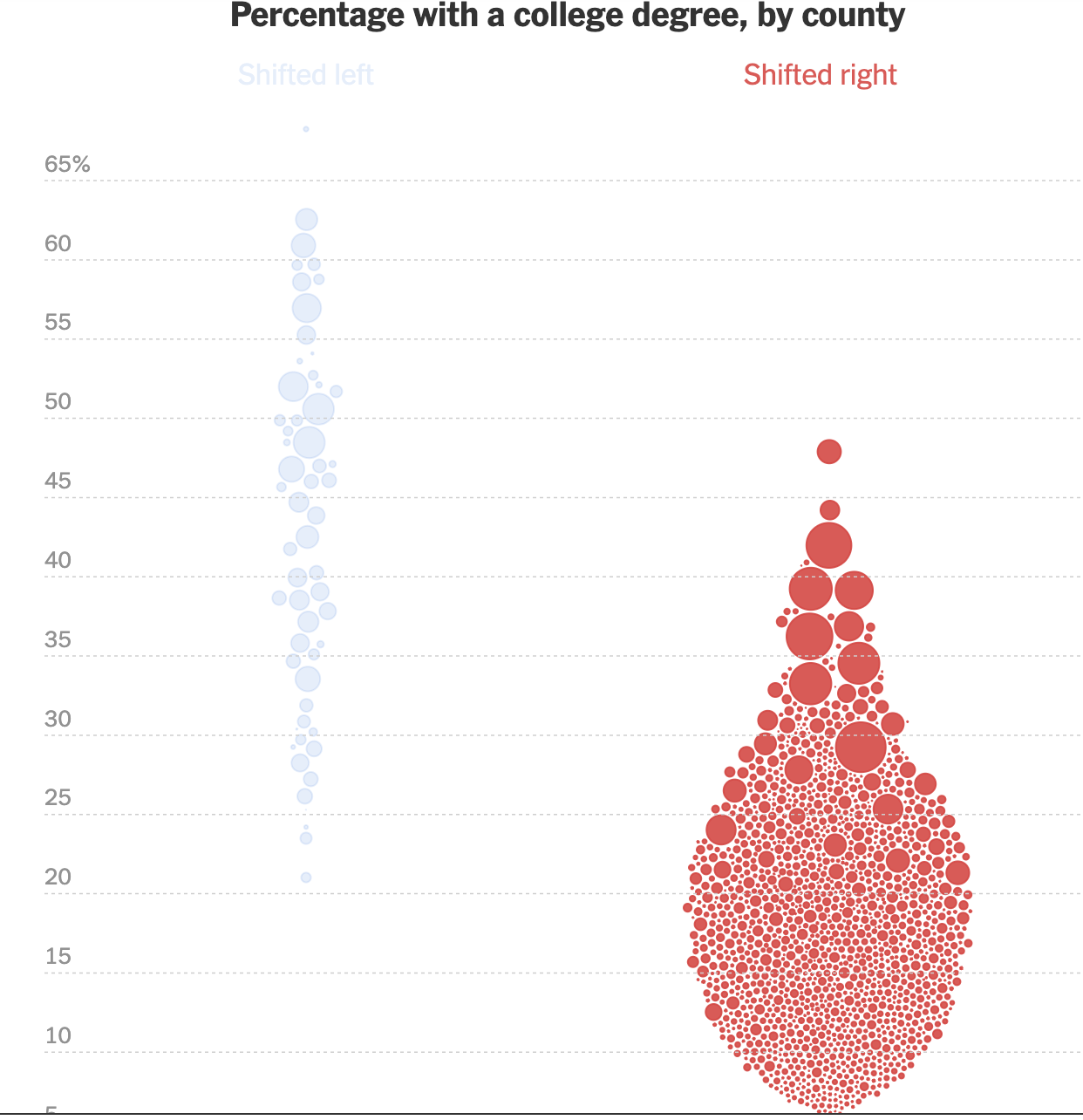 Even more ominous for the Democrats are the demographic and economic characteristics of these counties: The party’s sparse areas of growth are concentrated almost exclusively in America’s wealthiest and most educated pockets.