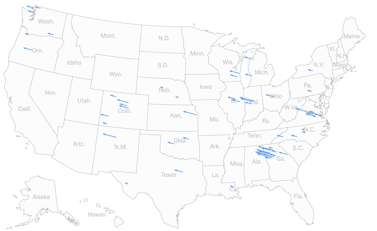 The steady march to the right at the county level reveals not just the extent of the nation’s transformation in the Trump era but also the degree to which the United States now resembles two countries charging in opposite directions.