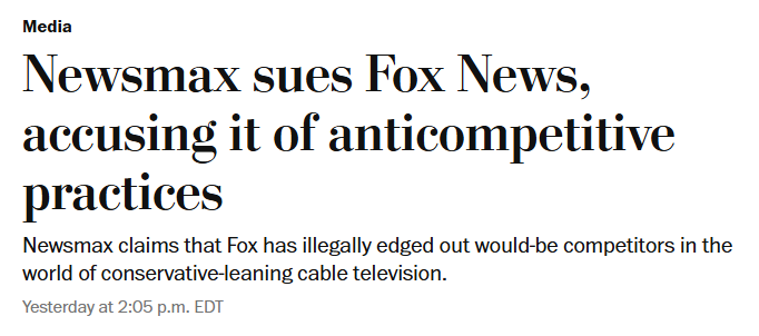 In the background like this, I had to say when I glanced at the notifications on my phone that Newsmax was suing Fox News for anticompetitive behaviors.